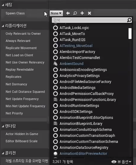 그러나 이렇게 모든 클래스가 나타나면 사용할 클래스를 선택하기 쉽지도 않고, 협업할 때에 상대방을 위해 C02_Mesh 클래스 이하로만 목록이 나타날 수 있도록 제한해주는 것이 좋다. 따라서 TSubclassOf 명령어를 사용한다.