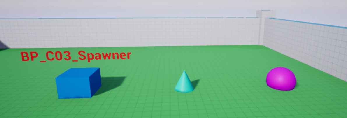 프로그램 실행 결과, BP_Spawner 액터를 기준으로 오른쪽으로 세가지 Mesh 모양이 다른 액터가 Spawn 되는것을 확인할 수 있었다.