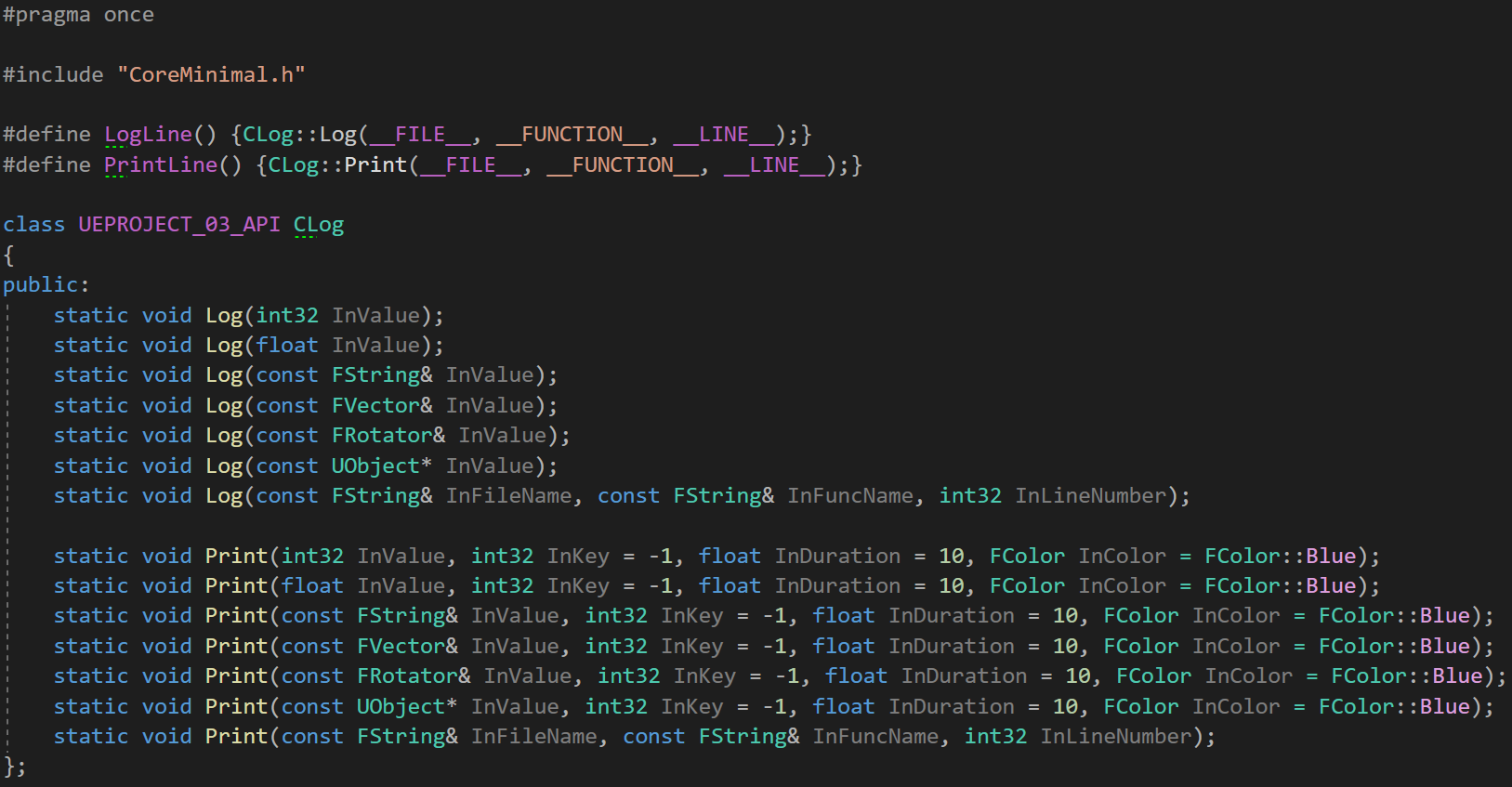 CLog 라는 이름의 헤더파일과 cpp 파일을 각각 생성한 뒤, Log와 Print를 도와줄 static 함수들을 변수 유형별로 선언해두었다.