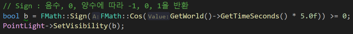 Light를 Cos 곡선에 따라 음수일 때 출력하지 않고, 양수일 때 출력하도록 만들어 불빛이 깜빡거리도록 구현하였다.
