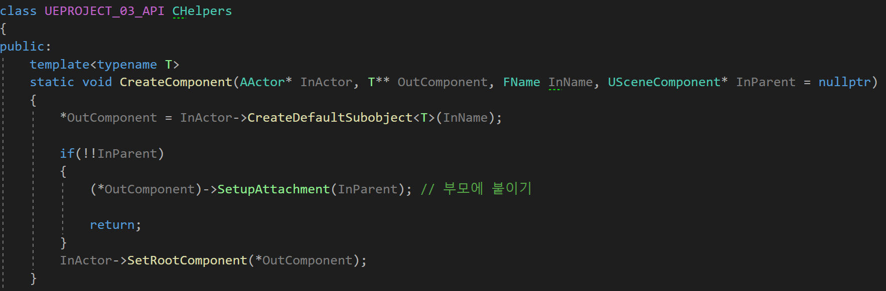 따라서 CreateComponent의 마지막 매개변수로 부모 Component가 들어온다면, (즉 부모 매개변수가 null 이 아니라면) 생성할 컴포넌트(OutComponent)에 SetupAttachment 함수를 통해 부모의 객체 아래 붙여주었다.