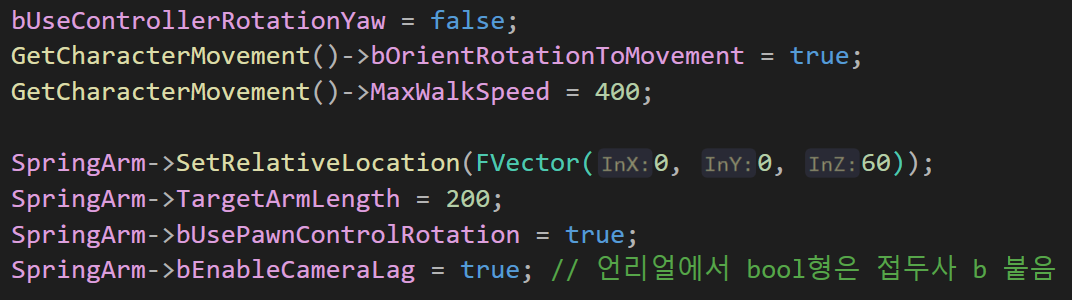 또한 Character의 기본 Controller 설정과, CharacterMovement 설정, SpringArm의 설정을 수행해주었다.