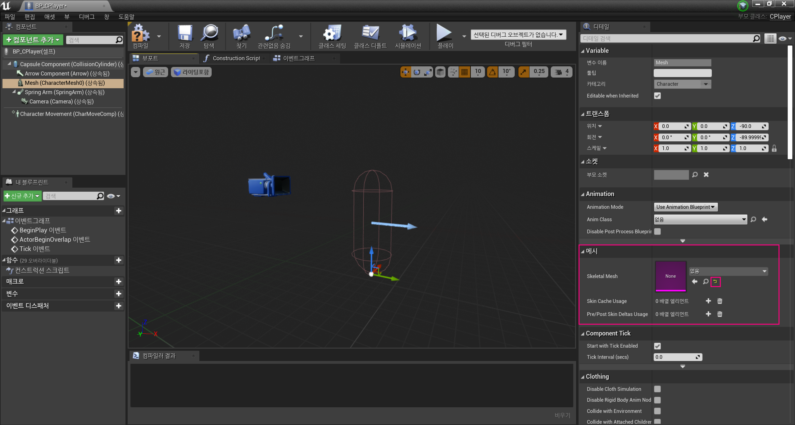 즉, 스켈레탈 메시의 기본값이 불러온 Asset으로 변경되어, 없음 상태가 기본이 아닌 상태가 된 것이다. 따라서 C++ 클래스에서 Character의 속성값을 변경하고 난 뒤, 블루프린트에 들어와서 되돌리기 화살표를 꼭 눌러 변경된 기본값을 적용시켜야 한다.