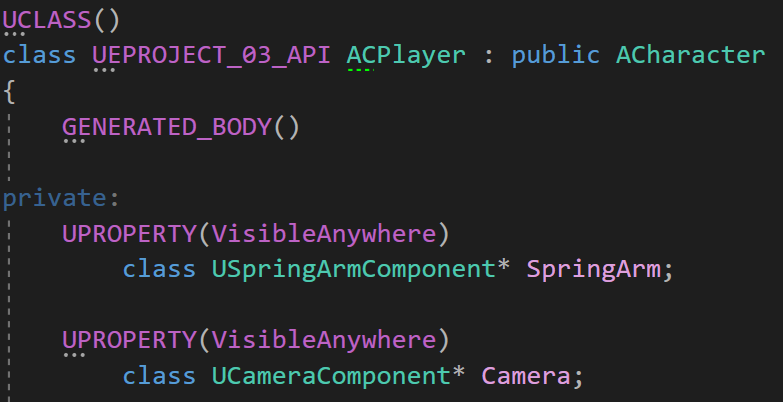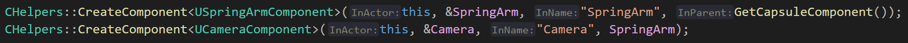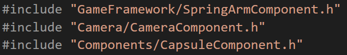 이후, CapsulComponent를 가져와서 부모로 설정해줘야하기 때문에 헤더파일을 불러오고, 나머지 변수를 초기화할 SpringArm, Camera 헤더파일도 호출하였다.