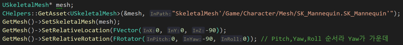 이후, Mesh의 기본 설정값인 Location과 Rotation을 초기화해주었고, 이때 Rotation은 저번에 공부했듯이 에디터 상과, C++클래스 상의 Roll, Pitch, Yaw 순서가 다르기 때문에 유의하여 작성해주어야 한다.