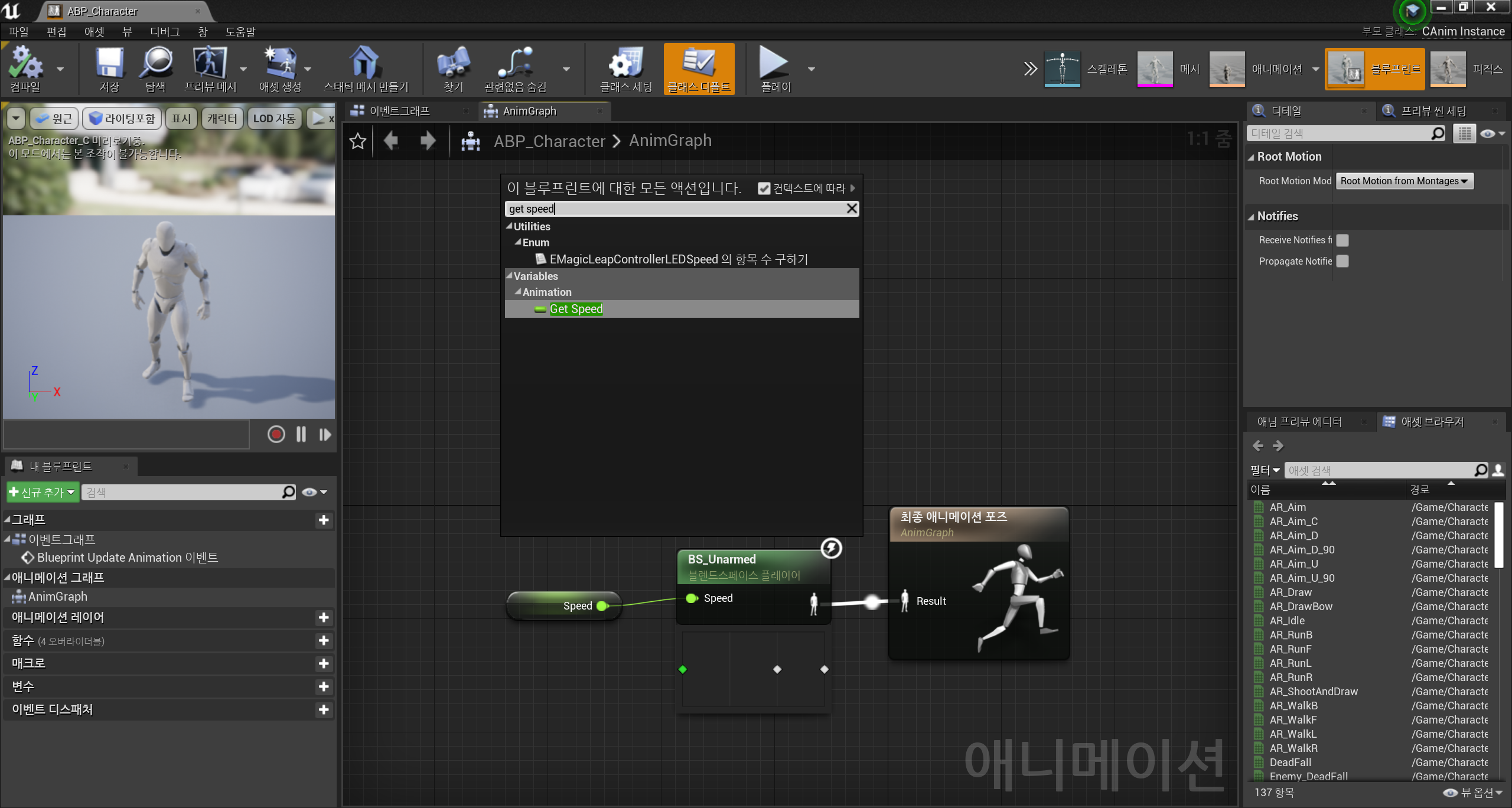 float speed 변수를 이용해서 Animation Blend Space가 조절되기 때문에 Blueprint클래스에서 읽기만 가능한 Speed 변수를 직렬화하여 생성했다.