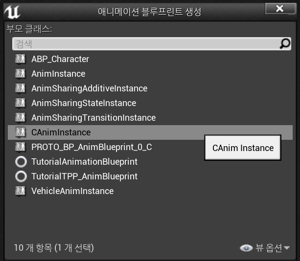 C++ 클래스를 통해 제작한 CAnimInstance를 애니메이션 블루프린트를 생성할 때 부모클래스로 설정할 수있게 되었다.