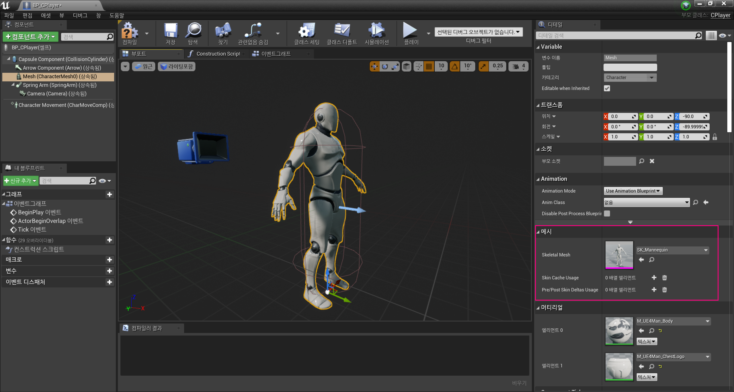 이후, 만들어진 Character 객체에 SkeletalMesh를 만들어 적용시킬 USkeletalMesh 에셋을 불러와 적용해주었다.