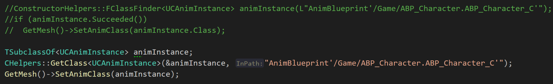 참고로 TSubclassOf 자체가 포인터형 클래스 타입이므로 animInstance 변수에 포인터를 붙이지 않고 바로 주소값을 전달해줘도 된다.