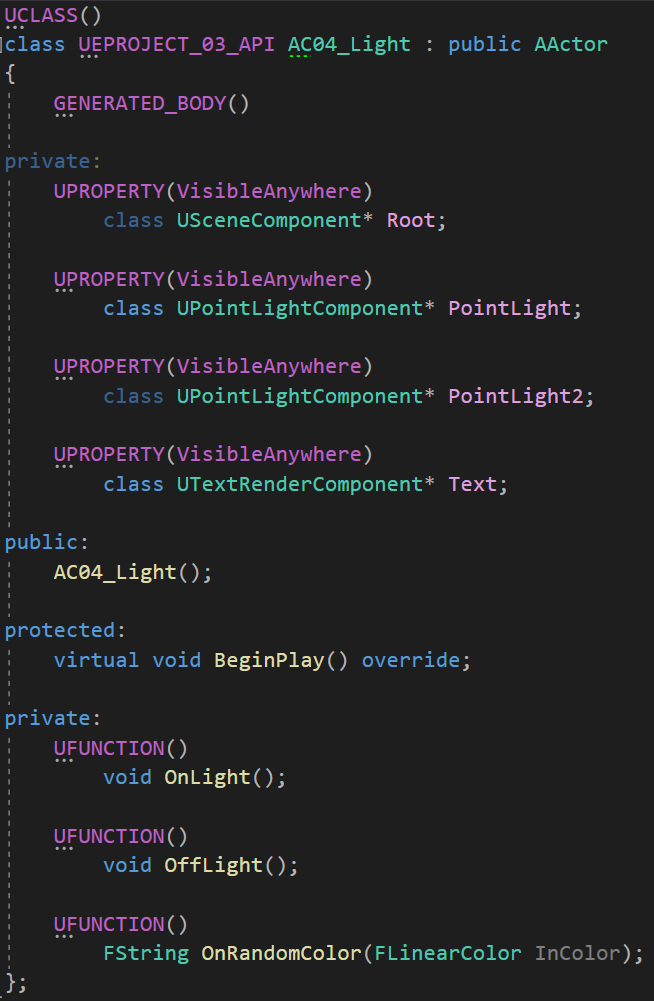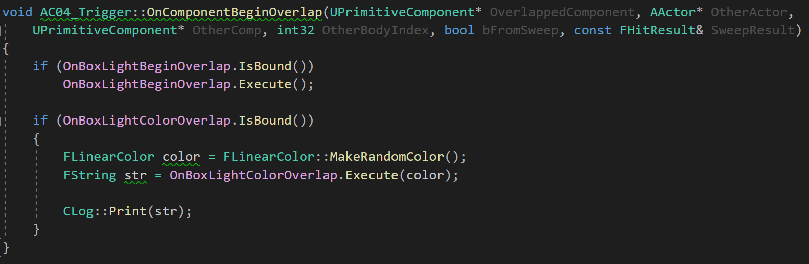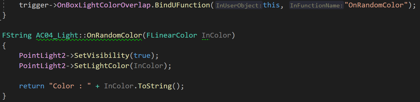 이후 FBoxLightColorOverlap OnBoxLightColorOverlap; 라는 델리게이트 변수를 생성한 후, Begin Overlap에서 랜덤 색상을 만들어 매개변수로 전달하며 Excute 해주었다. 이때 델리게이트의 반환값으로 FString을 설정했기 때문에 Excute 함수의 반환값을 FString str로 저장해두었다.