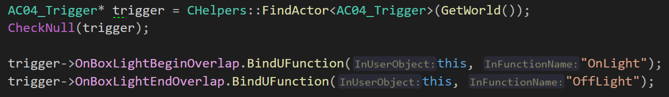 이렇게 만들어진 FindActor 함수를 통해 trigger가 존재하는 액터를 찾았고, 델리게이트를 등록해주었다.