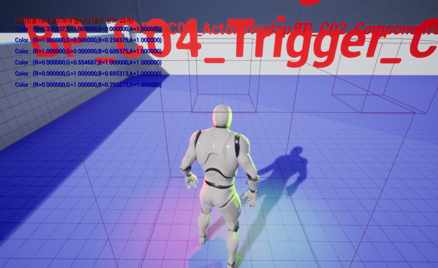 오른쪽 Point Light는 Begin Overlap 시 랜덤 색상이 출력되며 해당 정보가 Log로 출력되는 것을 확인할 수 있었다.