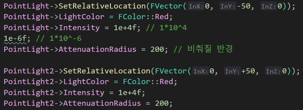 두 개의 Point Light는 위와 같이 초기화해두었는데, 여기서 Intensity를 특이한 수치로 초기화하였다.