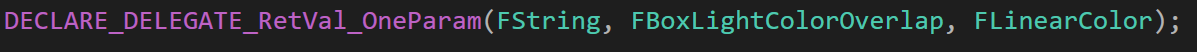 위 델리게이트는 Return 타입으로 FString을 가지고, 파라미터가 FLinearColor 하나라는 뜻이며 가운데 FBoxLightColorOverlap은 델리게이트의 자료형이다.