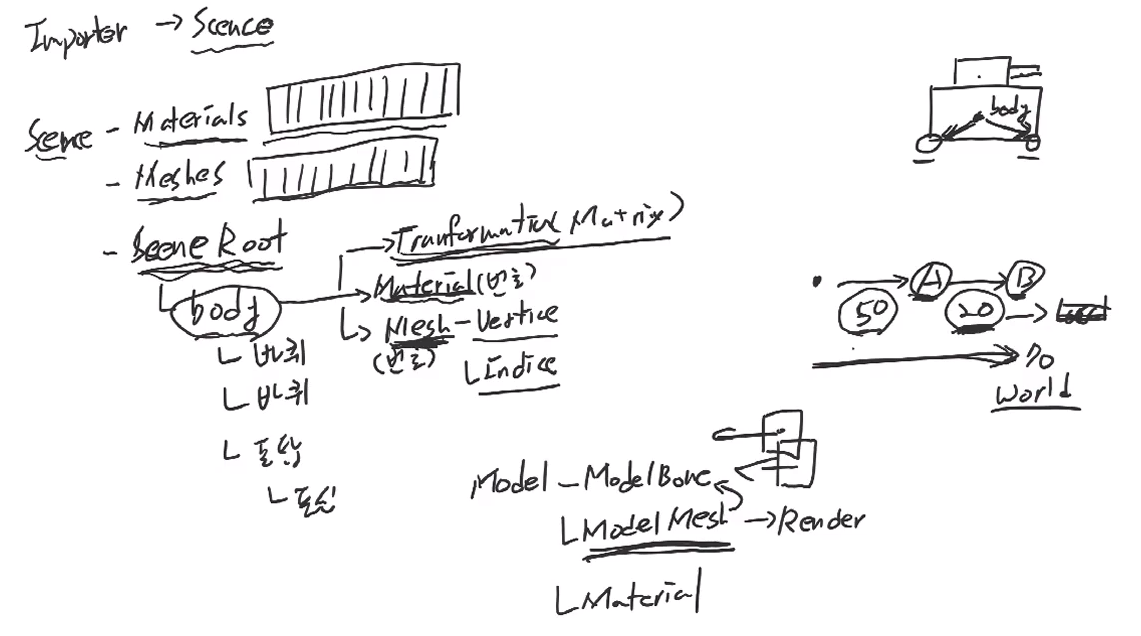 첫번째로 Assimp는 Importer 를 통해 Scene을 반환해준다. Scene이라는 객체는 3D 모델에 대해 모든 정보를 담고있는 Root이다.