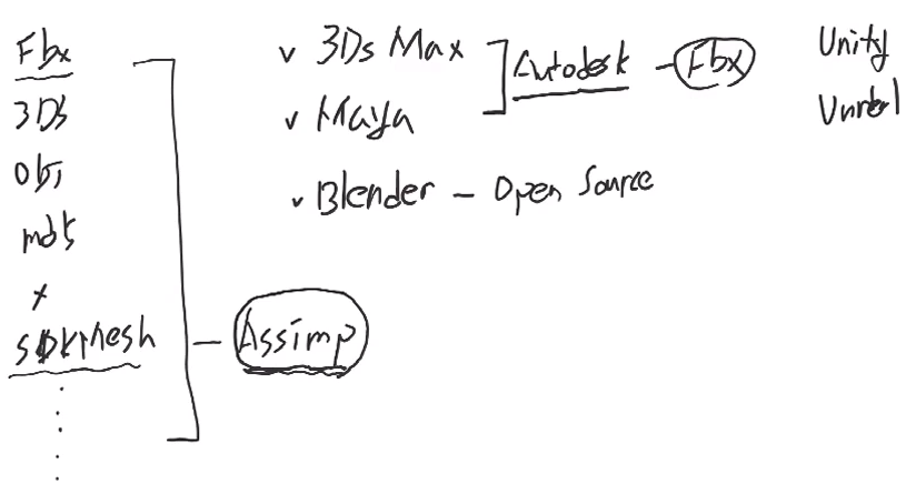 3D 모델의 파일 형식은 이처럼 매우 다양한데, 형식에 따라 개발 툴에서의 파일입출력이 가능하거나 불가능하게 나뉘었기 때문에, 프로그래머들은 Assimp 라는 프로그램을 사용하여 어떤 파일 형식이건 동일한 형태로 변환하여 사용할 수 있도록 하였다. (게임을 위해서 만들어진건 아니고, 만들어놓고보니 게임개발에 잘 사용되었다.)