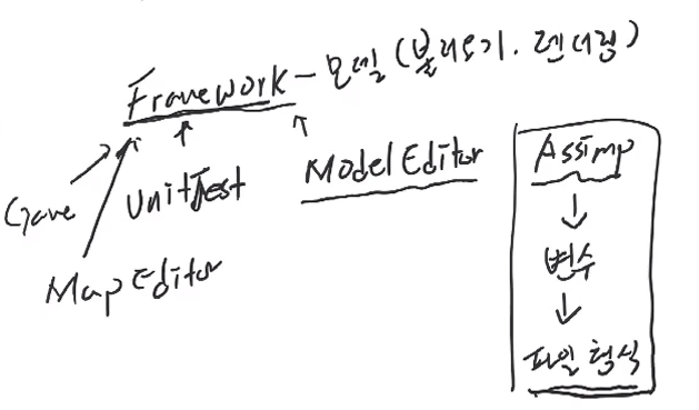 먼저, ModelEditor 클래스를 제작하여 Assimp에서 모델 형식으로 파일을 불러오고 해당 파일을 변수로 불러올 것이다. 이후 변수안에서 내가 쓰고자하는 데이터를 파일 형식으로 저장할 것이다. Model Editor에서 정제된 파일 형식은 Framework로 전달하고, Framework에서는 모델을 불러오고 렌더링할 것이다.