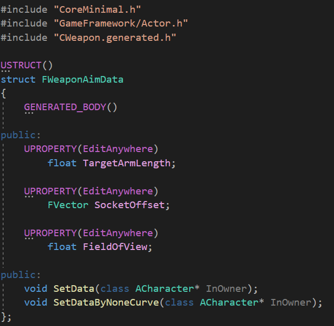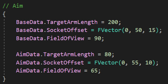 Aim 상태인 경우와, 아닌 경우를 각각 Aim Data와 Base Data로 설정하기 위해 두 개의 변수를 선언하였고, 구조체 안에 TargetArmLength와, SocketOffset, FieldOfView 값을 설정해주었다.
