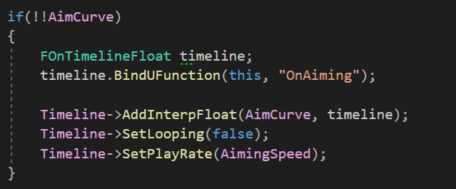 FOnTimelineFloat 객체를 생성하여 On Aiming 함수를 바인딩해놓고, Timeline Component에 만들어두었던 Curve와 함수를 할당한 객체를 AddInterpFloat 함수로 전달해주었다.