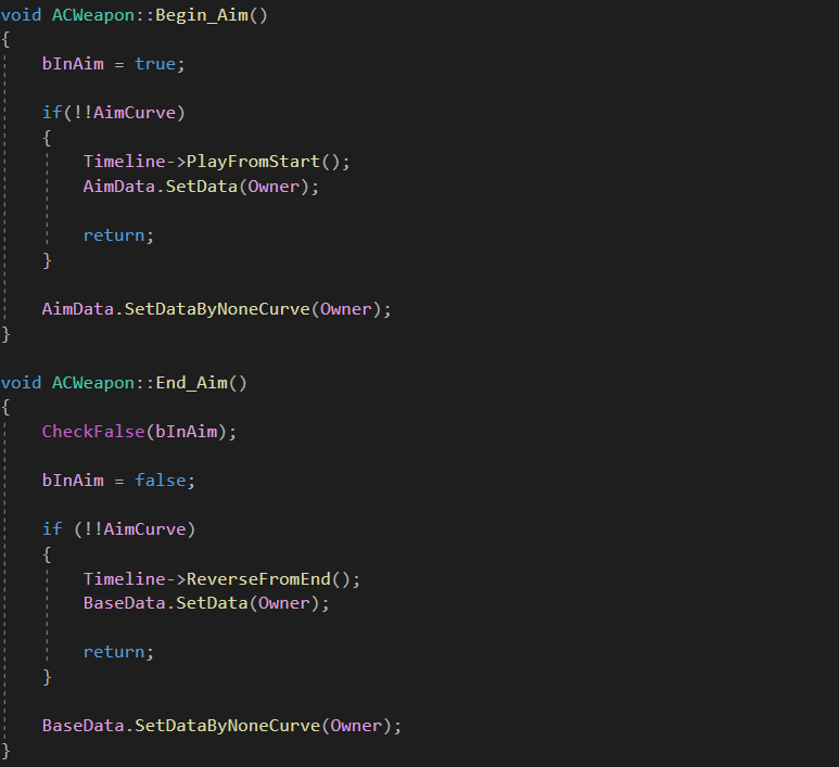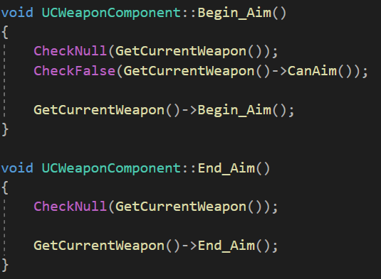 이후 GetCurrentWeapon()->Begin_Aim() / End_Aim() 함수를 호출하며 현재 장착중인 무기인 Weapon 클래스의 함수를 호출하였다.