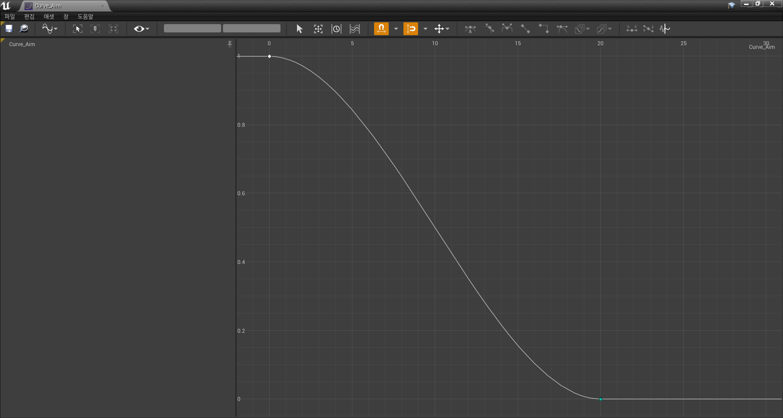 추가적으로, Aim 모드와 일반 모드 사이가 변환될 때 자연스러운 카메라 이동을 구현하기 위해 엔진 에디터에서 Aim Curve를 생성해주었고,