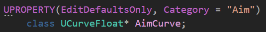 해당 Curve를 C++ 클래스에 가져와서 UCurveFloat* AimCurve 변수에 저장한 뒤, 타임라인 객체에 초기화 해 주었다.