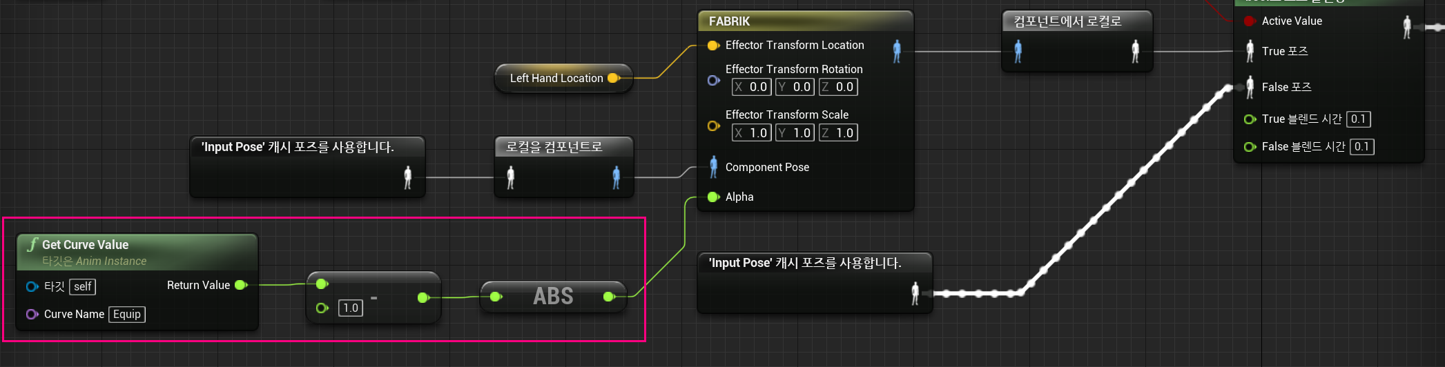 이렇게 만들어진 Curve값을 사용하기 위해 애니메이션 블루프린트에서 Get Curve Value 함수를 사용하였고, 0에서 1로 변환하며 음수가 나올 수 있지만 음수인지 양수인지는 상관없이 수치값만 사용하기 때문에 ABS를 취하였다.