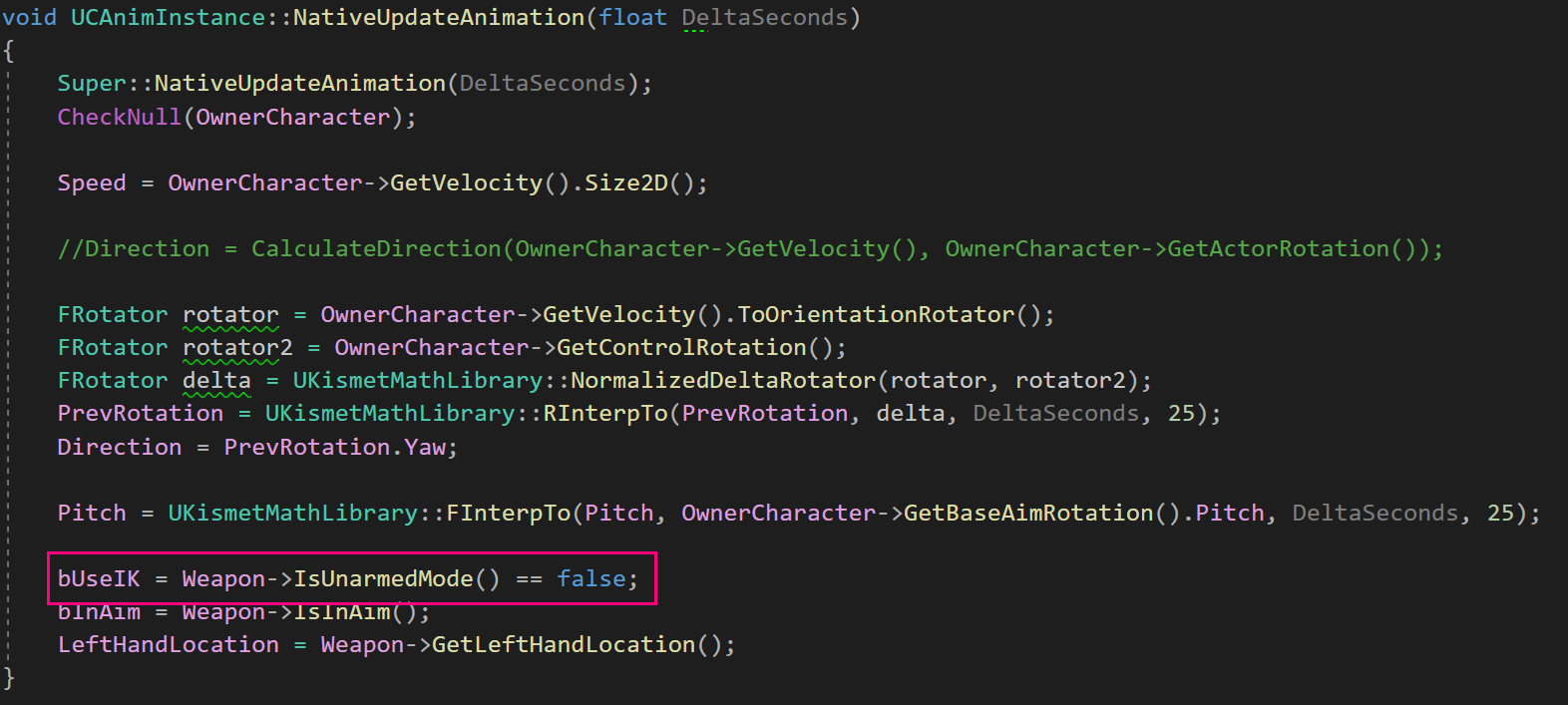 bUseIK 변수는 Weapon의 IsUnarmed 모드가 False인 경우 True가 되도록 하였다.