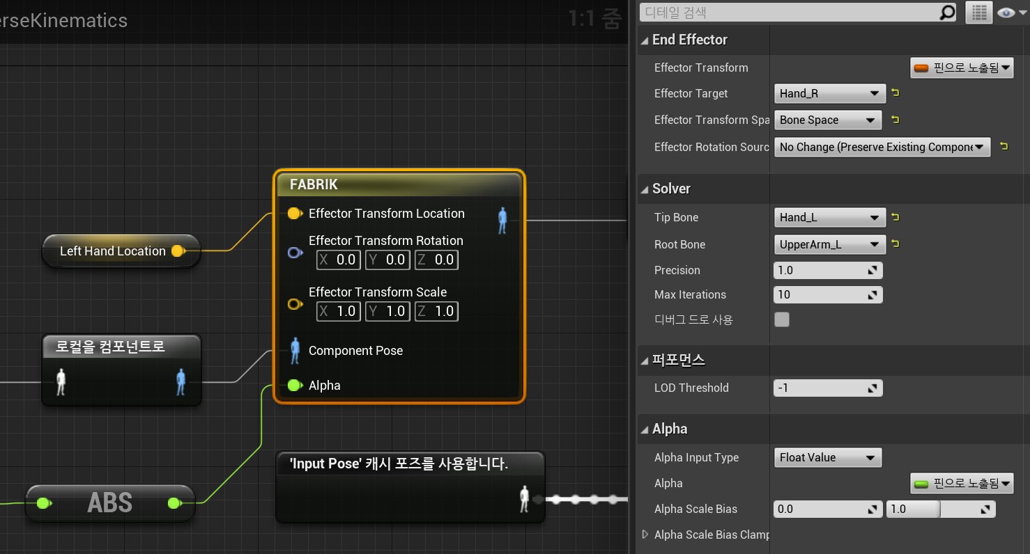 IK는 Bone을 늘려야 함으로 프로그래밍에 의해 값이 바뀌어야 하기 때문에 컴포넌트 공간에서 이루어진다. 따라서 FABRIK를 bool 포즈 블렌딩과 캐시 포즈 사용 노드에 연결할 때 자동으로 컴포넌트 <-> 로컬 간의 공간 변환이 이루어진다.
