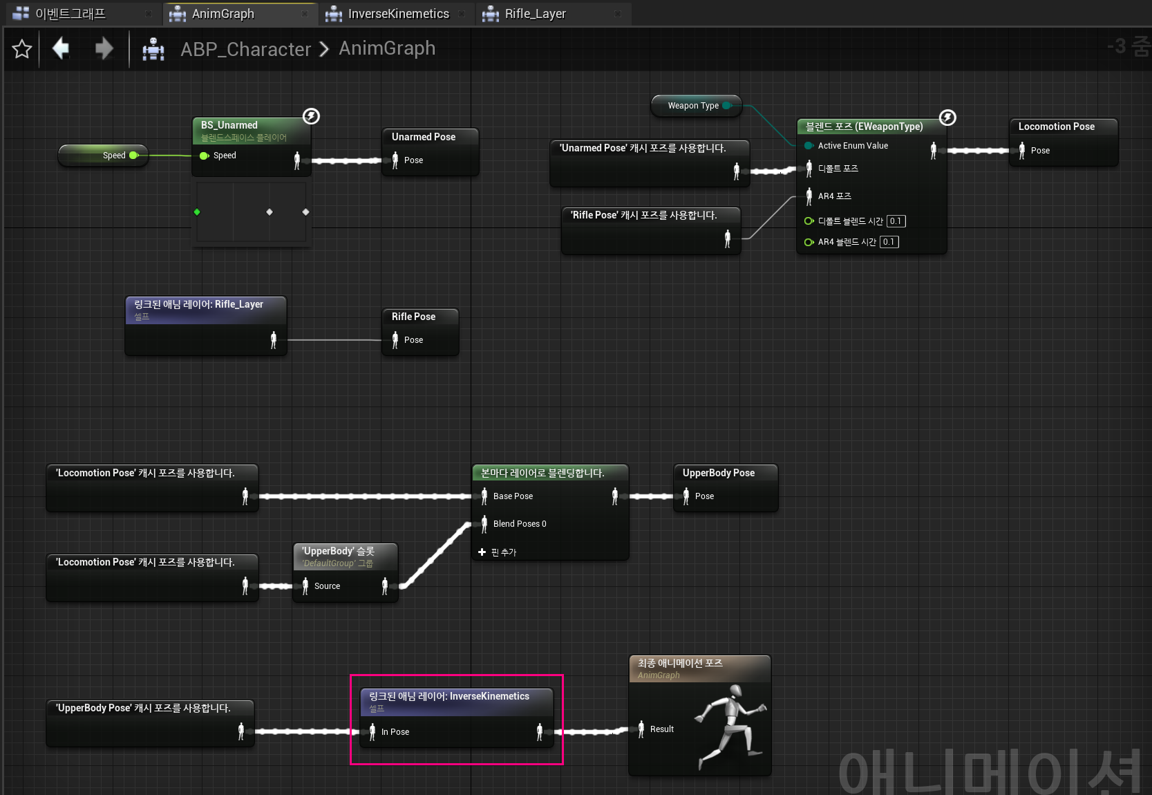 Player의 애니메이션 블루프린트에서 IK는 모든 애니메이션 연산이 끝나고 가장 마지막에 적용시켜야 하기 때문에 최종 애니메이션 포즈의 바로 전 단계에 위치시켰다.