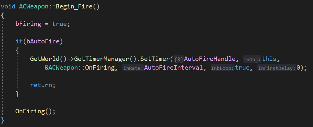 이후 InRate 매개변수로 임의의 수치(0.15)를 전달하고, Loop를 true로 설정하여 0.15초마다 OnFiring 함수가 실행되도록 설정하였다. 마지막 매개변수 InFirstDelay는 시작 시간임으로 0을 넣어주었다.