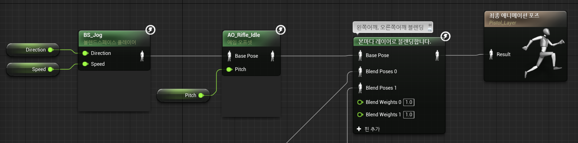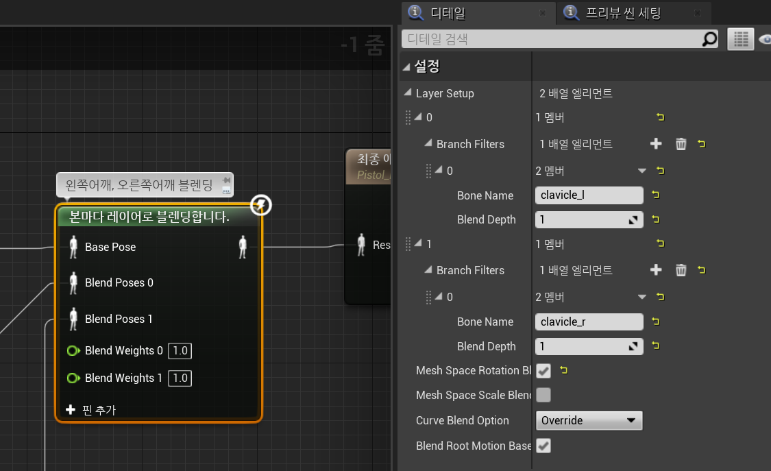 이후 왼팔과 오른팔 각각에 Pistol Idle 애니메이션을 Component Pose로 연결하여 성공적으로 Pistol Idle의 팔모양을 본마다 레이어로 블렌딩하였다.