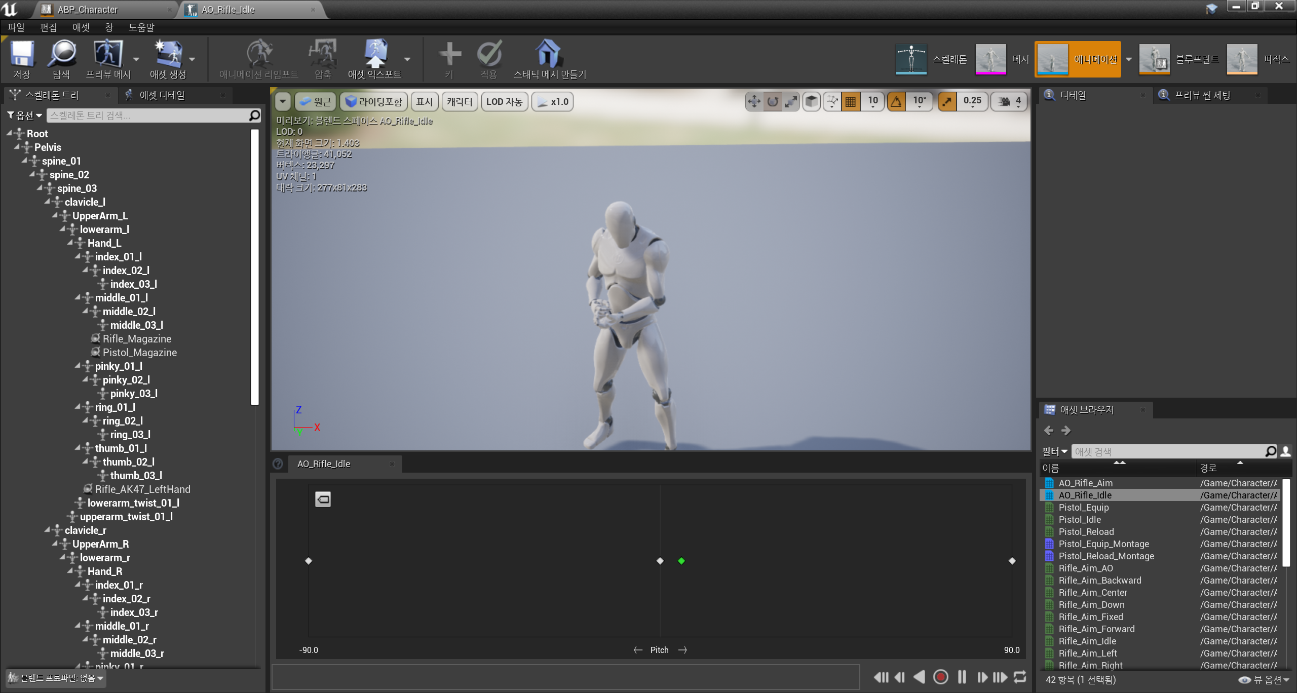 이때 권총의 Idle 모션의 양 팔(어깨)만 Rifle 애니메이션에 추가해야 Rifle의 AO(Aim Offset)을 살릴 수 있다.