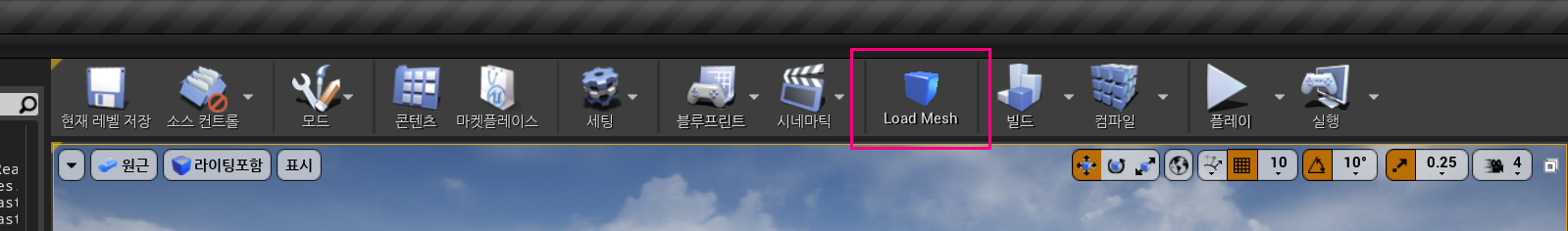 이후 소스코드 빌드 후 엔진을 재시작하여 확인하면 툴바에 위치한 LoadMesh 버튼에 파란색 직육면체의 Icon이 성공적으로 추가된 것을 확인할 수 있었다.