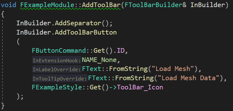ExampleModule 클래스에서 기존 LoadMesh를 생성할 때 호출한 AddToolBar 함수에 매개변수를 추가로 전달해주었다.
