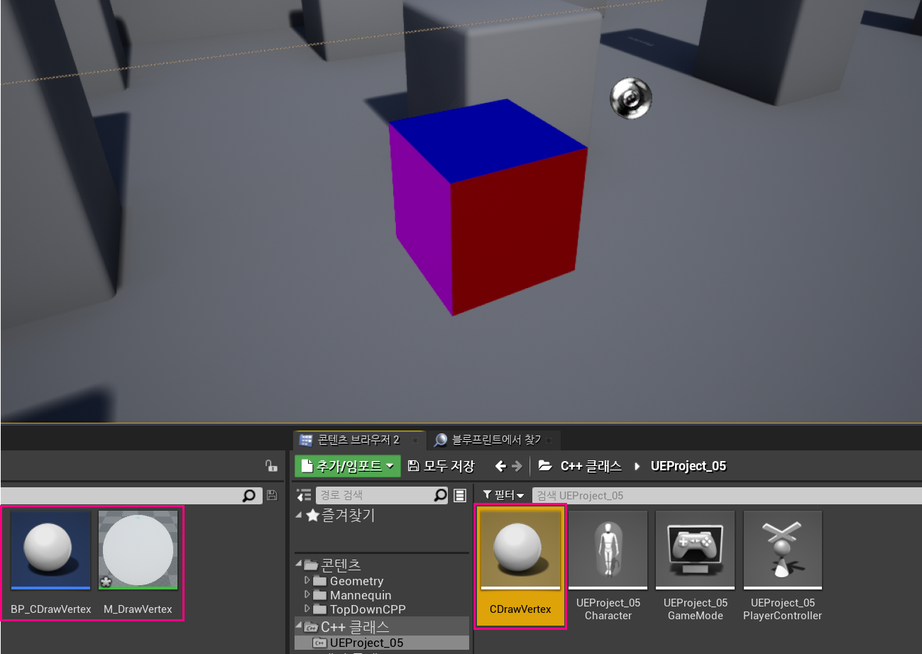 이후 C++ 클래스인 DrawVertex를 기반으로 블루프린트 BP_CDrawVertex를 생성하였고,