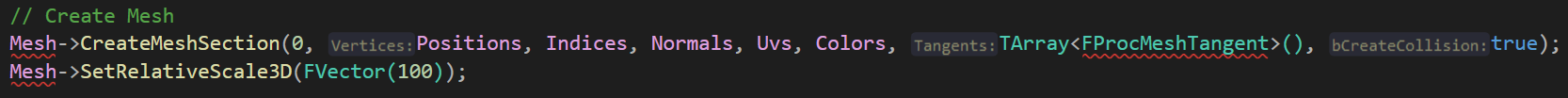 Mesh->CreateMeshSection(0, Positions, Indices, Normals, Uvs, Colors, TArray<FProcMeshTangent>(), true);