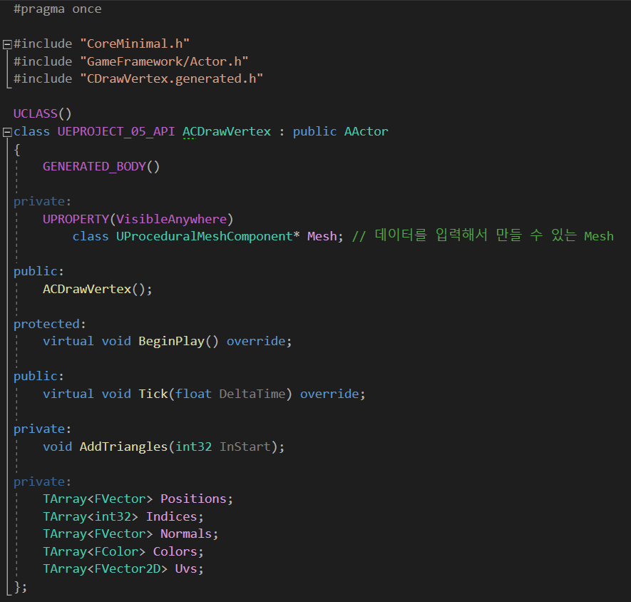 그밖에 정점의 데이터인 Positions, Indices, Normals, Colors, Uvs 변수들을 TArray로 각각 선언해주었다.