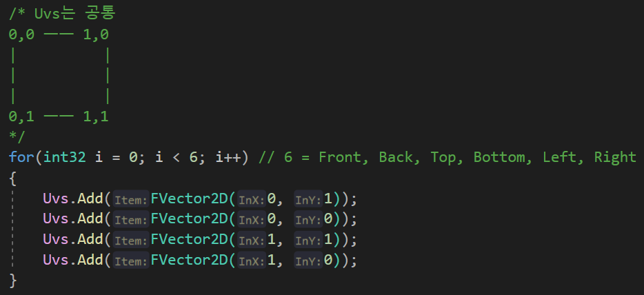 모든 면의 Position, Color, Normal, Index를 다 추가하고 난 후, Uvs는 모든면이 같은 순서로 그려지기 때문에 한번에 추가하였다.