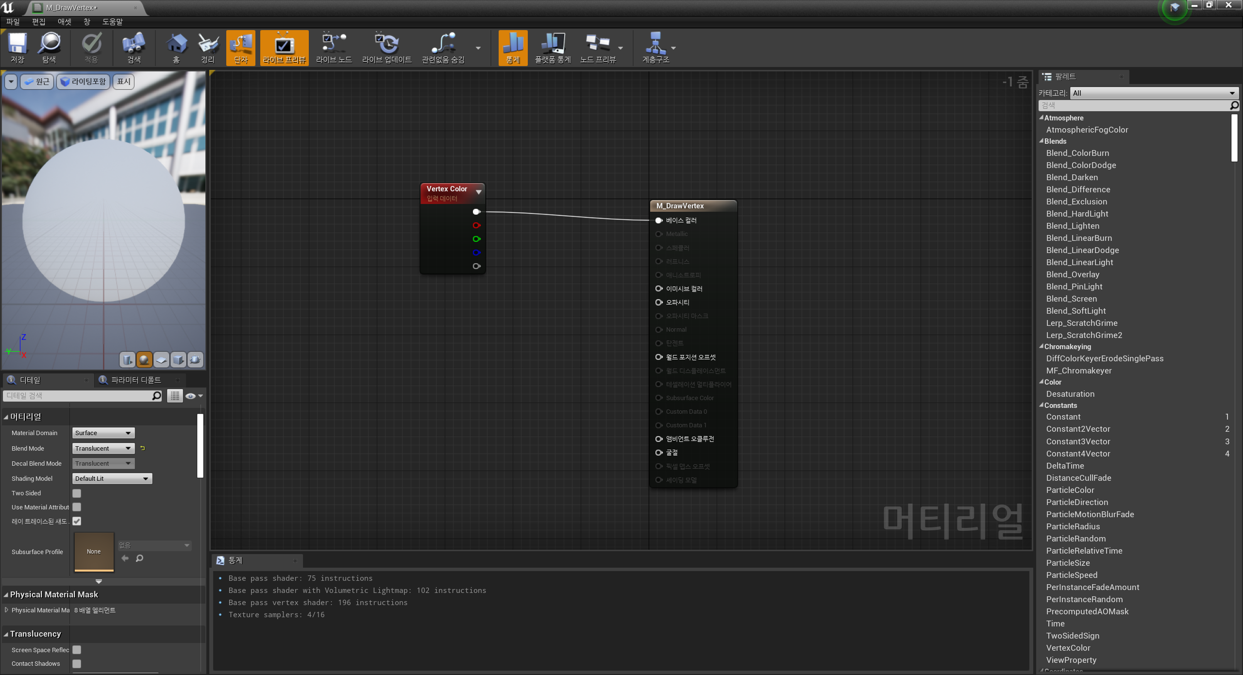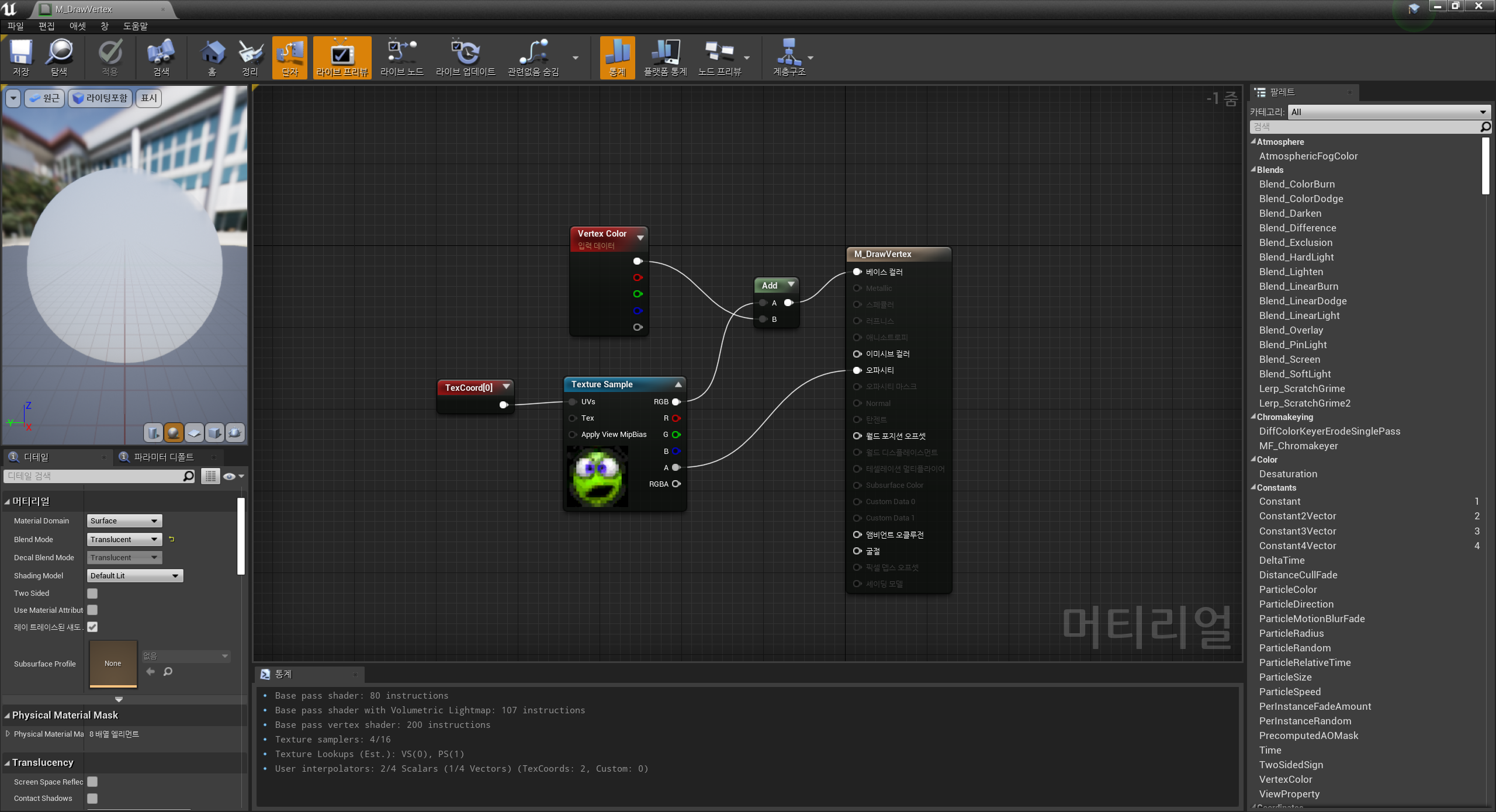 또한 정점의 UV 정보를 TexCoord로 읽어와 Texture Sample을 베이스컬러로 함께 출력한다면