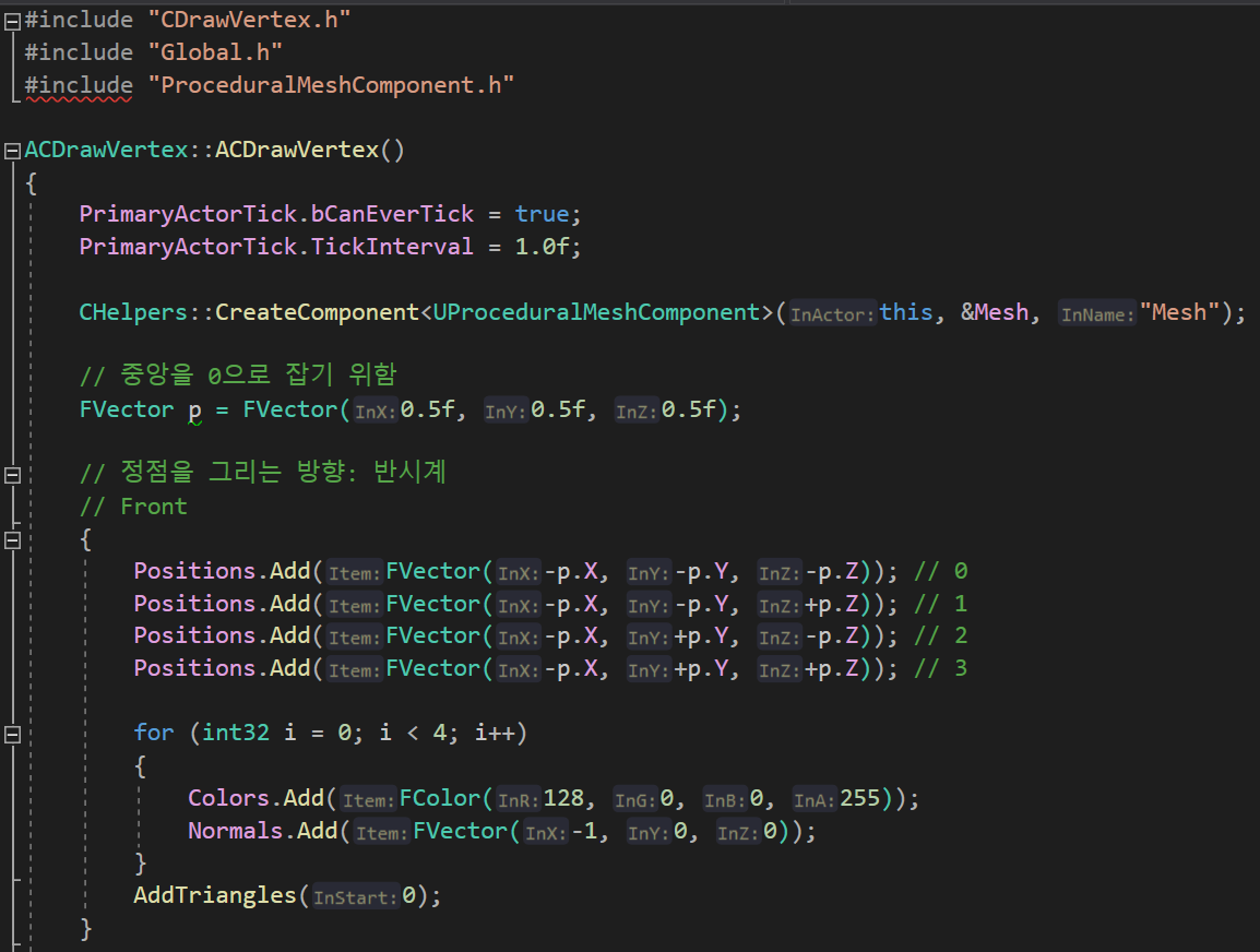 먼저 ProceduralMeshComponent를 초기화한 뒤, Vertex를 그리기 위해 Positions와 Colors, Normals를 추가하였고