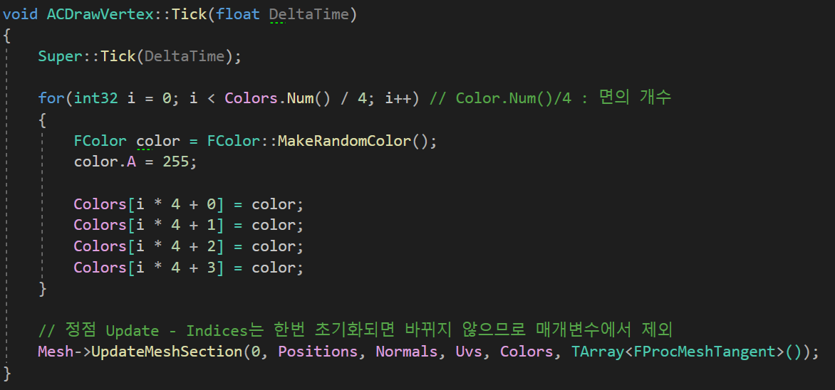한번 만들어진 정점을 잘 수정하진 않지만, 만약 수정이 필요한 경우에는 Mesh의 UpdateMeshSection 함수를 이용하여 정점을 Update 시켜줄 수 있다.
