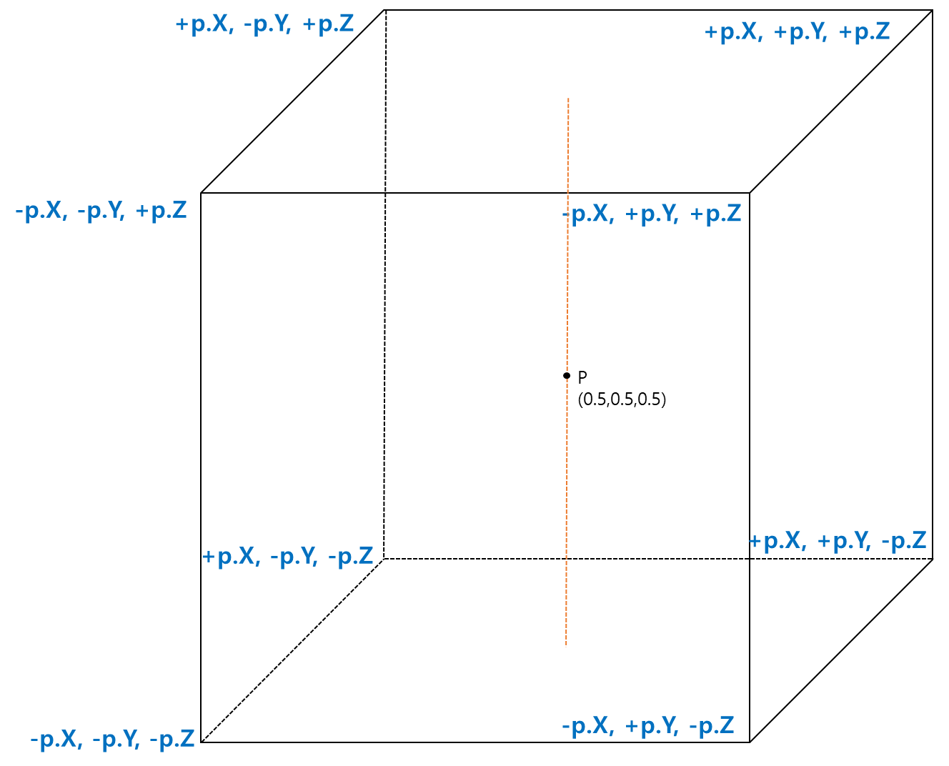 중앙점 P가 존재할 때 각각의 왼쪽, 오른쪽, 상단, 하단, 앞, 뒤의 정점 좌표는 위와 같이 나온다.
