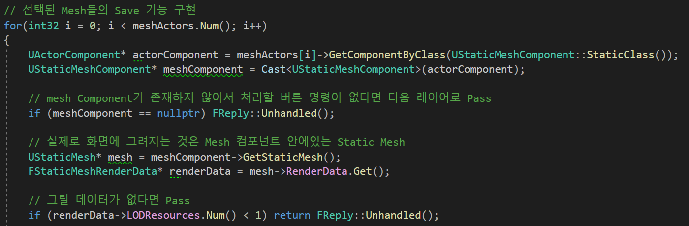 선택된 Mesh들의 for문을 돌면서 객체들의 Mesh Component에 접근하였다.