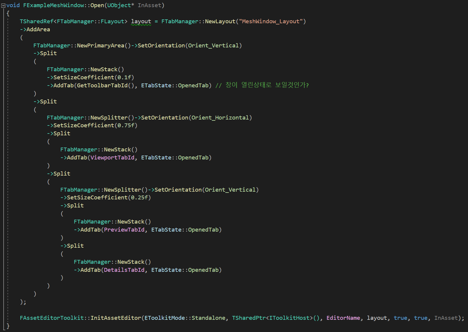 Open 함수의 맨 아랫줄을 보면 FAssetEditorToolkit 클래스의 InitAssetEditor 함수를 통해 커스텀 Window 창에 Layout을 적용시켜 초기화할 수 있다.