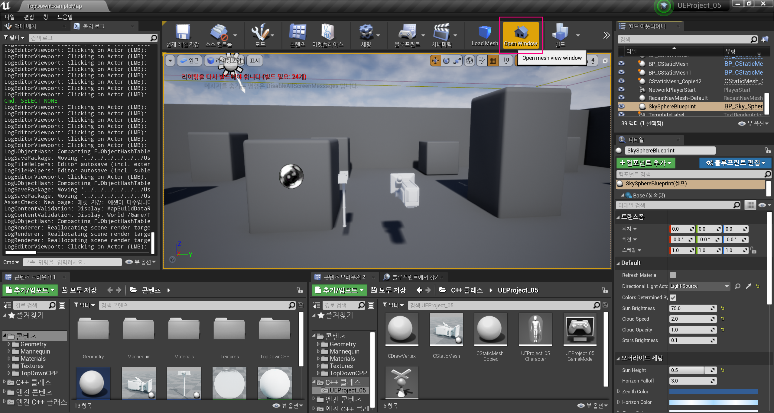 OpenWindow 버튼이 눌렸을 때 실행되는 OnClicked_OpenWindow 함수에서는 현재 선택중인 액터를 전달하여 Window 객체로 만들어둔 ExampleMeshWindow 클래스의 OpenWindow 함수를 실행시킨다.