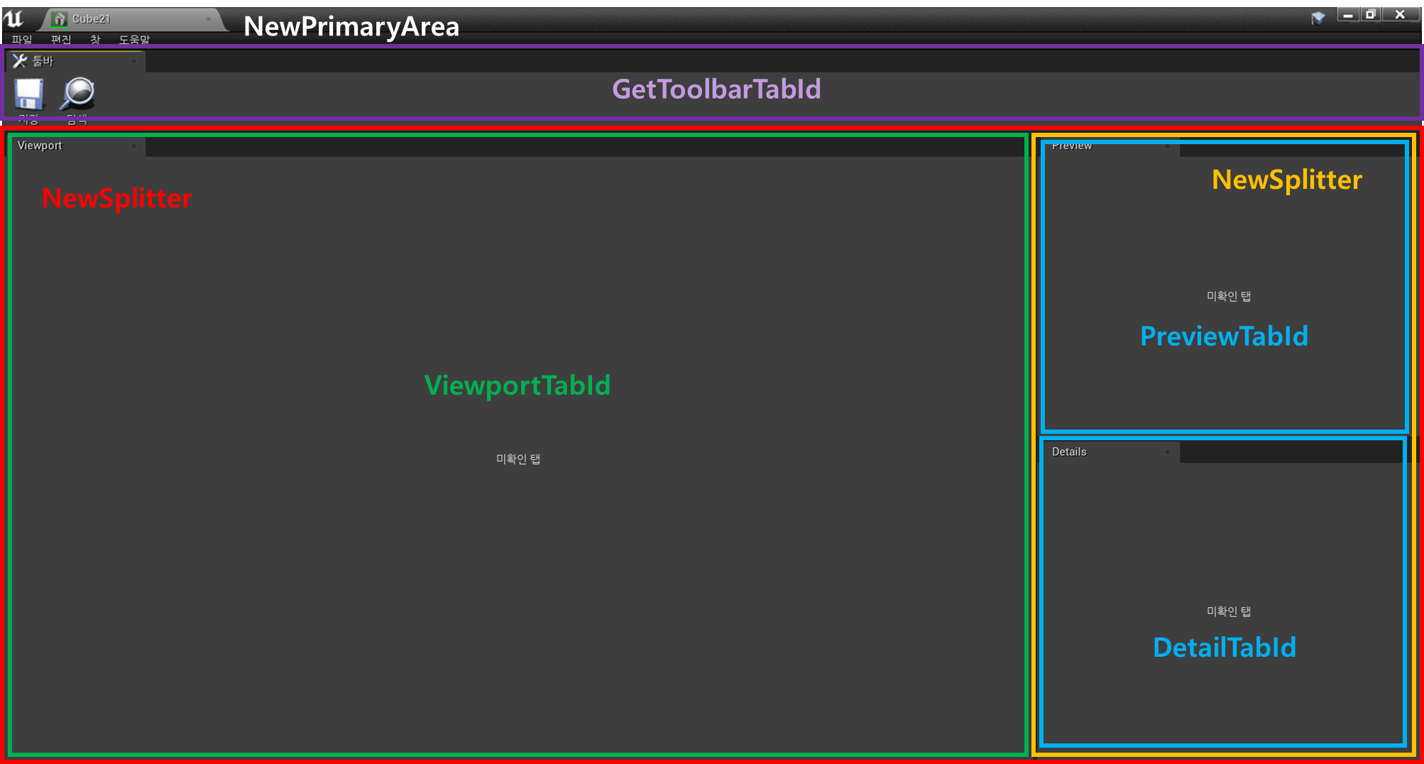 FTabManager의 NewStack 함수로 요소를 추가할 공간을 만들고, 그안에 SetSizeCoefficient 함수로 배치될 비율을 설정한 뒤, AddTab 함수로 추가할 탭의 속성을 초기화하였다.