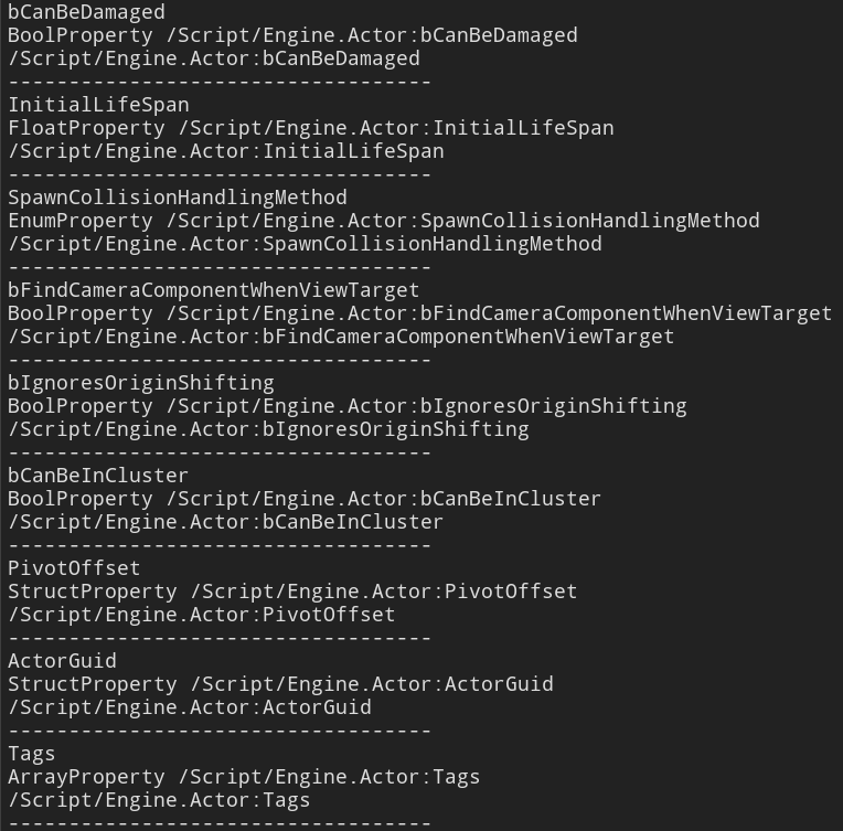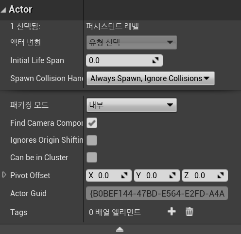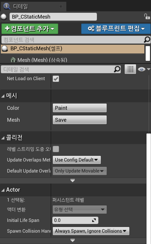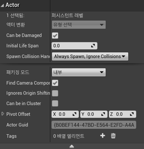 Can be Damaged 부터, Initial Life Span과 Spawn Collision HandlingMethod 등등 Actor 카테고리에 존재하는 속성 순서대로 내용이 출력된 것을 볼 수 있었다.