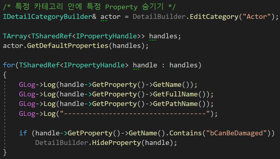 우선 숨기려는 속성이 포함된 카테고리를 받아와야 하기 때문에, IDetailLayoutBuilder 클래스의 EditCategory 함수로 Actor 카테고리를 가져와 IDetailCategoryBuilder 객체로 저장하였다.