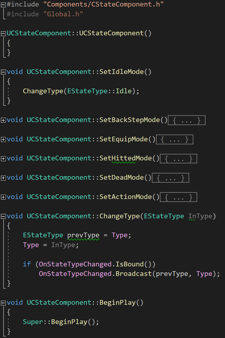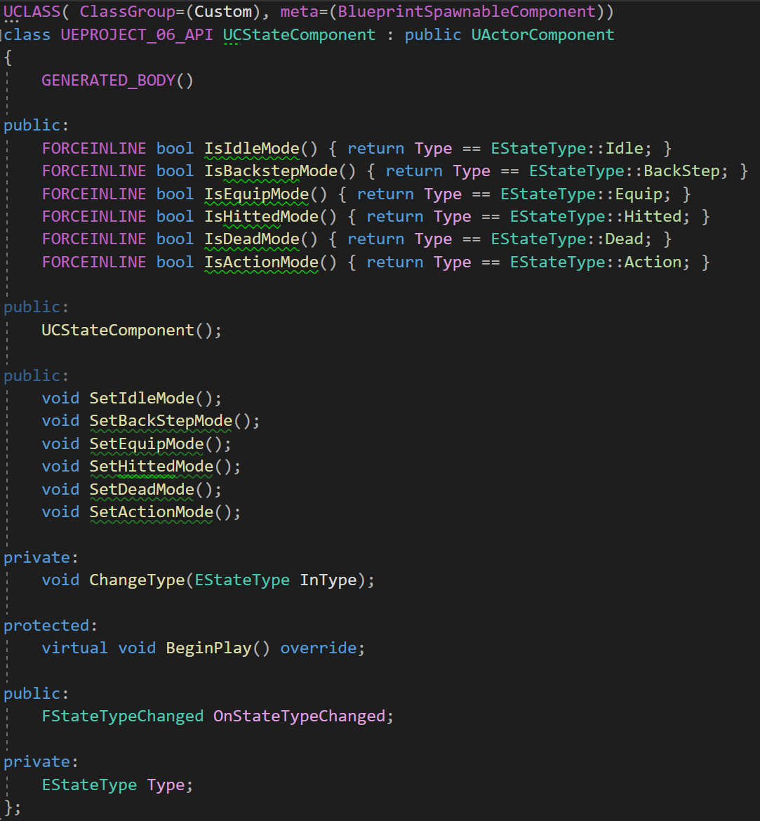 또한 상태가 변화될 때마다 실행되는 OnStateTypeChanged 함수를 등록시킬 수 있는 FStateTypeChanged의 다이나믹 멀티캐스트 델리게이트를 선언해주었다.